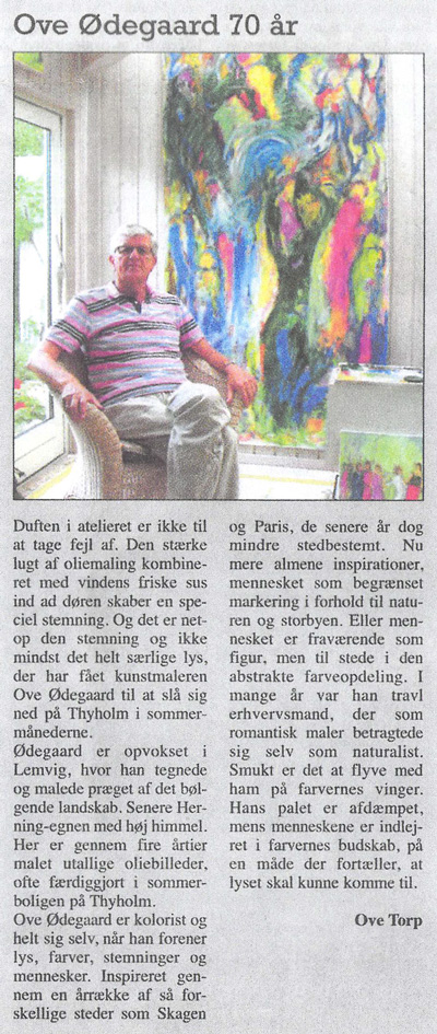 Duften i atelieret er ikke til at tage fejl af. Den stærke lugt af oliemaling kombineret med vindens friske sus ind ad døren skaber en speciel stemning. Og det er netop den stemning og ikke mindst det helt særlige lys, der har fået kunstmaleren Ove Ødegaard til at slå sig ned på Thyholm i sommermånederne.