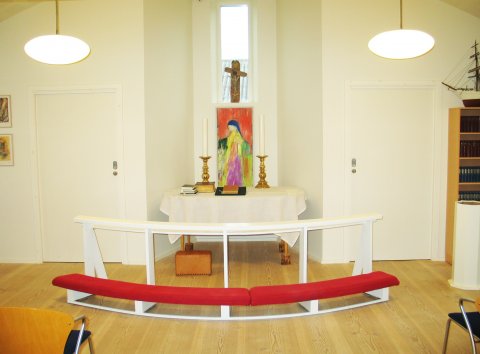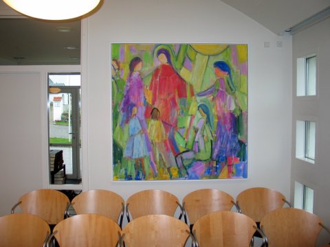 Hertil har jeg malet to billeder, i samarbejde med menighedsrådet. En meget positiv oplevelse. Jeg valgte “Lad de små børn komme til mig”, idet præsten ville bruge billederne til konfirmandundervisning.